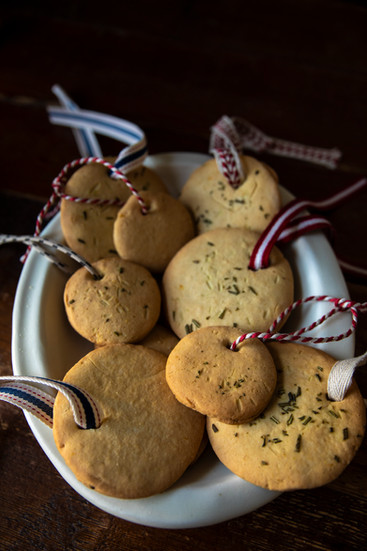 On your lightly floured bench put the dough on top and then cut it into half. Roll out the dough to about 4mm thick and cut using rounds of 5cm and 9cm (I used my potato fondant cutters, but you can improvise with any shapes you have if you don't have specific cutters). Remember they will expand in the oven so ensure they aren't too close to each other. Find a utensil to make a small hole at the top of the cookie (I used the end of a squarerish spoon end) it is best to give a good poke for bigger holes as it will close up as the pastry rises and it depends on the size of your ribbons too. Ensure you do not put the hole too near the top, as when you thread the ribbons through, the cookie can sometimes crack, so aim for slightly higher than midway. Gently press the rosemary into the top of some of the cookies ensuring they keep their shape. Transfer the cookies onto the lined baking trays.