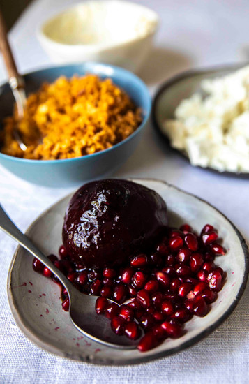 Spoon the Black Garlic, Pomegranate Sauce, Raspberry Vinegar over the Beets